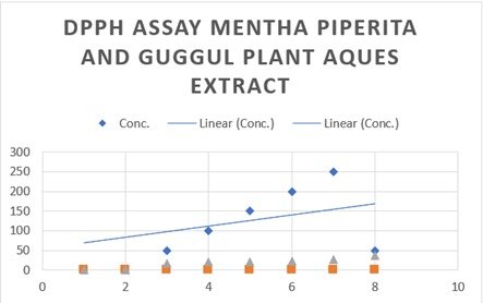 Free radicals are extremely reactive atoms or molecules that have one or more unpaired electrons on their outer orbital and have the potential to harm biological cells. The human body naturally creates antioxidants to combat free radicals, but because oxidative stress and aging cause more free radicals to develop, an exogenous antioxidant is required. The Plantae family has a lot of potential as a source of exogenous antioxidants because it is the largest family in the plant world. The goal of this study was to ascertain the antioxidant properties of the aqueous and ethanol extracts of mentha and guggul leaves, respectively. The DPPH technique was used to measure antioxidant activity, and the findings were noted for further study.
