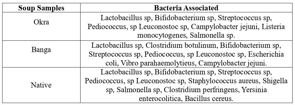 A study to evaluate the use of activated charcoal to detoxify bacterial toxins in soured soups was carried out. An activated charcoal solution was prepared. Three different types of soups (okra, banga, and Kalabari native (Odu-Fulo) were used in this study. The soups were prepared and left for 48 hours at ambient (room) temperature for them to get soured. Five microliters (5 ml) of each soured soup sample were homogenized, and 1 ml from the stock was used for serial dilutions. The pour-plate method and streaking techniques were used to isolate and identify the bacteria present. The lateral flow assay device, Biothreat Alert test strip, and Enzyme Immunoassay (EIA) kits were used to detect the bacterial toxins, while activated charcoal was used to test the detoxifying effectiveness of the bacterial toxins present. The result showed that Lactobacillus sp, Bifidobacterium sp, Streptococcus sp, Pediococcus, sp Leuconostoc sp Bacillus cereus, Clostridium perfringens, Campylobacter jejuni, Vibrio parahaemolyticus, Yersinia enterocolitica, Salmonella sp, Shigella sp, Escherichia coli, Staphylococcus aureus, Listeria monocytogenes, and Clostridium botulinum were associated with the soured soups, Bacillus cereus toxin, and Staphylococcus aureus exotoxins were detected in the native soup, Clostridium botulinum toxin in banga soup, and none were found in the okro soup, and also indicated the effectiveness of activated charcoal solution in absorbing (removing) the bacteria toxins in soured soups.