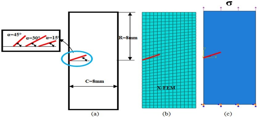 The extended finite element method (X-FEM) has been used to solve fracture mechanics, problems in materials with various behavior laws (for example, isotropic, orthotropic or piezoelectric materials... For each type of material, it is necessary to obtain “enrichment functions” which model the behavior of the fields of displacement and stresses in the vicinity of the front of crack. In this paper, fatigue crack propagation analysis was modeled, by the extended finite element method X-FEM to evaluate the total energy and strain energy at the angled crack length, and to have the development of the increment time concerning the different values of α which is equal to 15°, 30° and 45, this development has been studied numerically by solving the problem of finite elements by the computer code ABAQUS. Quadratic 4-node elements (CPS4R) were used.